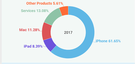 In 2017, over 60% of Apples revenue came from the iPhone. The remaining was the iPad and Mac. Services like digital content, apple pay and apple care make up over 13% of its revenue. Additionally other products such as Apple Tv, Apple Watch, Beats products, iPod touches and other apple branded and third-party accessories make up 5.61% as shown in the diagram below.