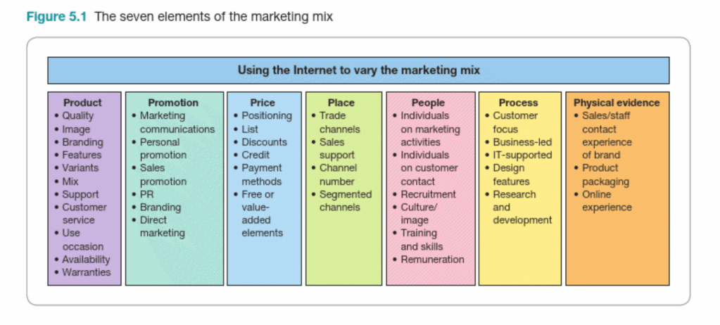 The marketing mix entails a series of seven key variables; Product, Price, Place, Promotion, People, Process and Physical Evidence (7 P’s)